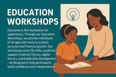 Education is the foundation for opportunity. Through our Education Workshops, we provide individuals of all ages with tools to achieve personal and financial growth. Our workshops cover life skills, academic support, financial literacy, digital literacy, and leadership development—all designed to help participants build confidence and independence. These sessions are structured to reduce barriers to education while equipping families with the knowledge and resources needed to overcome systemic challenges. By investing in education, we open doors to upward mobility and long-term success.